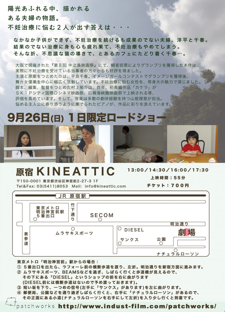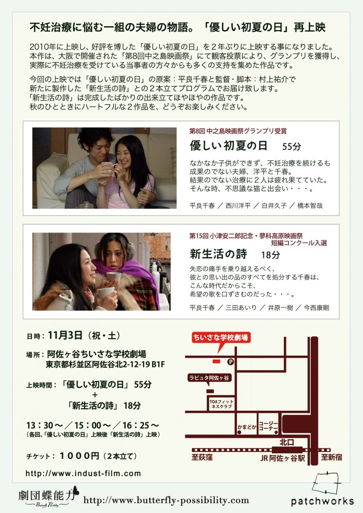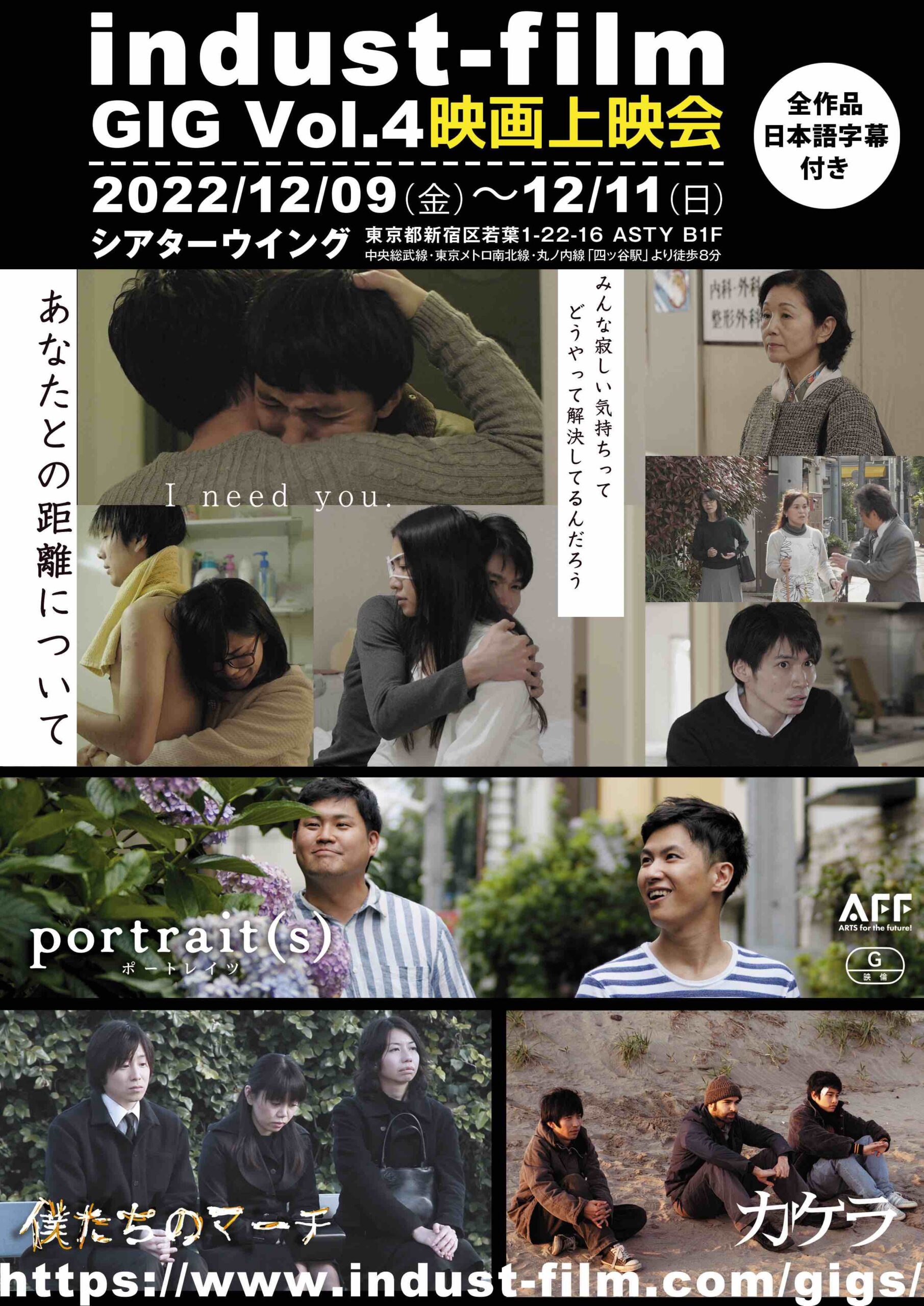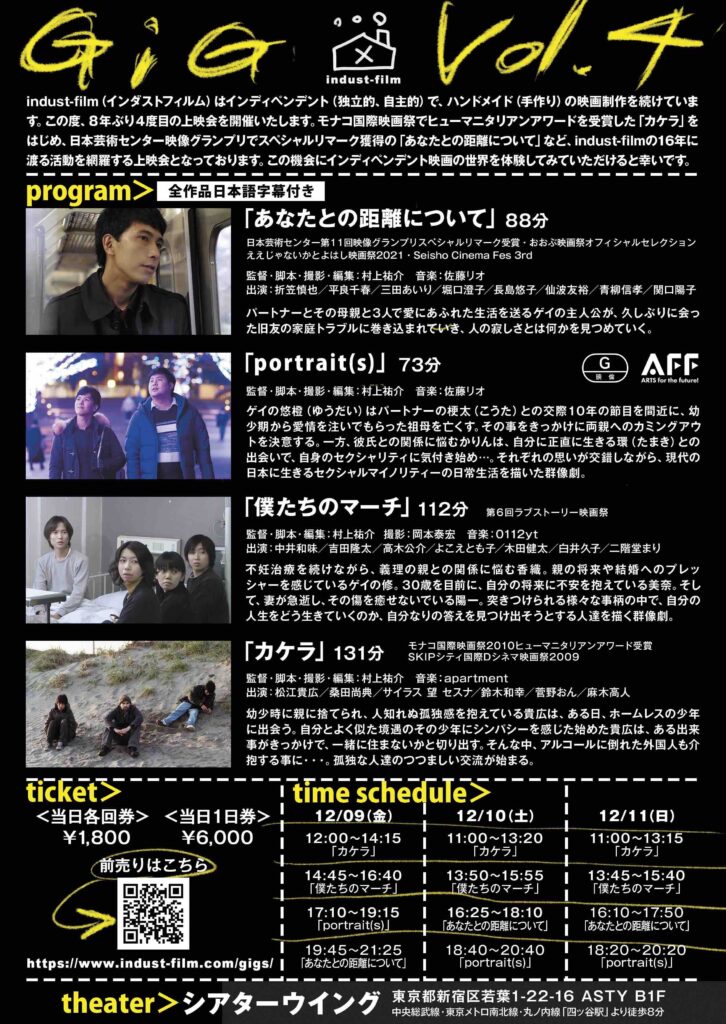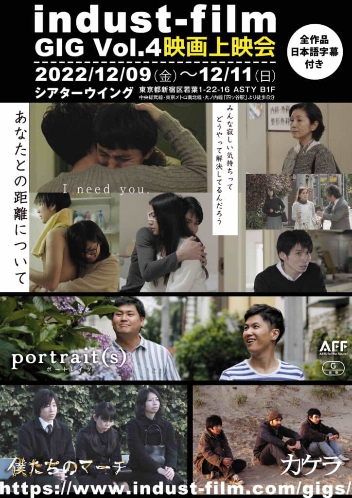 GIG Vol.4 2022/12/09〜12/11上映作品>>「カケラ」「僕たちのマーチ」「あなたとの距離について」「portrait(s)」場所>>シアターウィング GIG vol.4映画上映会 ブログレポート 上映会ページ GIG Vol.3 2014/11/24(月)上映作品>>「カケラ」「家族ごっこ」「ボクノホンネ」「ずっと蒼く」「青空」「僕たちのマーチ」場所>>ちいさな学校劇場 上映会終わりました ブログレポート GIG Vol.2 2012年11月3日(祝土・文化の日)上映作品>>「優しい初夏の日」 55分 HP「新生活の詩」 18分 HP場所>>ちいさな学校劇場 11/3の上映会が終って ブログレポート GIG Vol.1 2010年09月26日(日)「優しい初夏の日」場所>>原宿KINEATTIC ありがとうございました ブログレポート